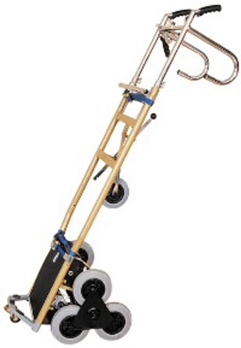 Muy útil para subir ataúdes por las escaleras, sin esfuerzo, donde no hay ascensor. Basta presionar un botón para hacer girar las ruedas con base triangular giratoria para subir/bajar grada a grada.