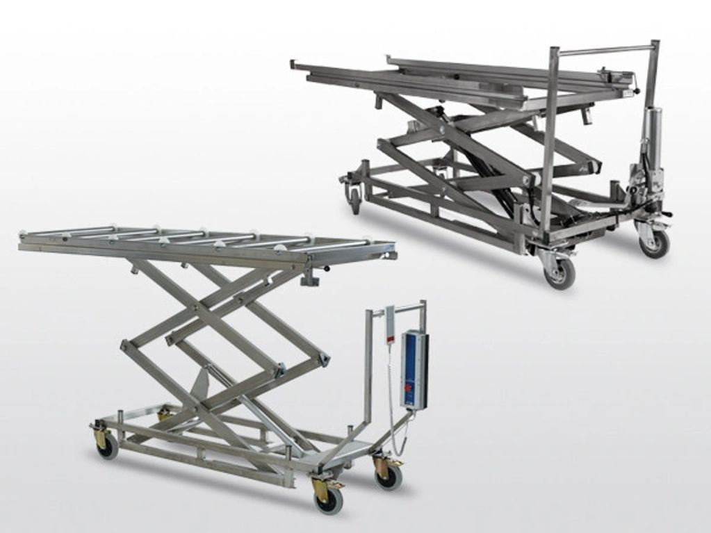 Elevadores para ingresar el cadáver en cámaras frigoriferas, hornos; movimentar los ataúdes en estantes de exposición.