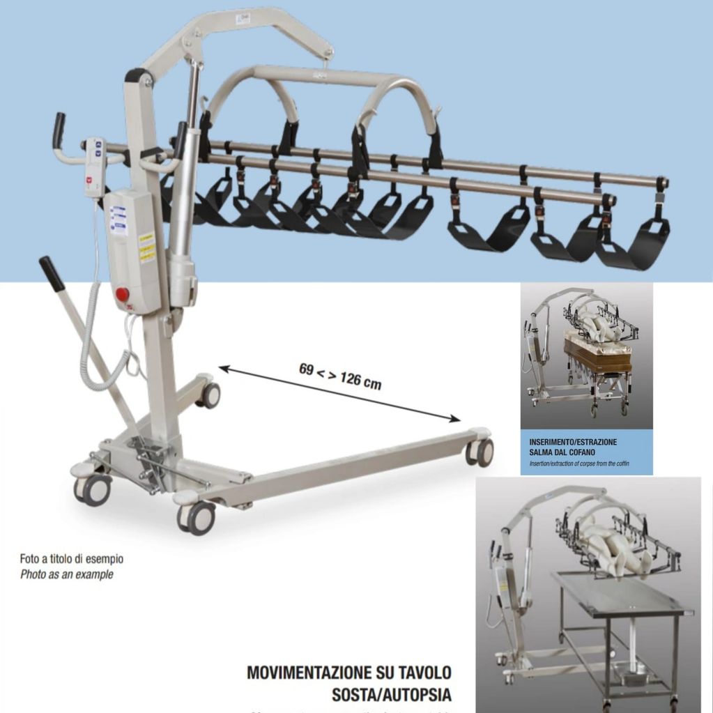 Útil para movilizar, elevar y colocar el cadáver sobre la camilla de preparación, el ataúd o la mesa de autopsia. Permite que una sola persona logre hacer todo el trabajo.
